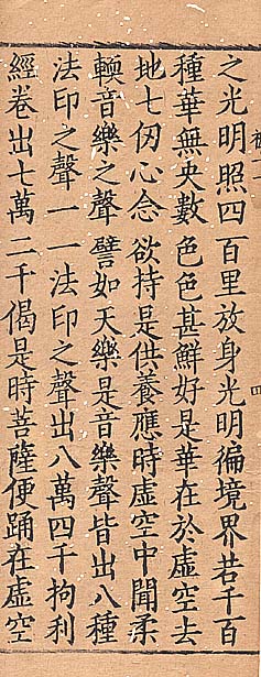 | ここに提示する宋・元版の断簡(半葉のほぼ三分の一)は、所謂「人工的断簡」で、右が南宋理宗の時から平江府磧砂延聖院で開彫され、黄麻紙に刷られた磧砂版系宋版大蔵経中の『宗鏡録』(北宋の釋延壽撰)の卷十二の一部分で、左が元版の『廣弘明集』(唐の釋道宣撰)の卷二十二に含まれる、朱世卿の「性法自然論」の終わりの一部分である。尚、日本の古写経の断簡に就いては、書画の186・680を御参照されたし。 |