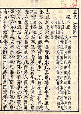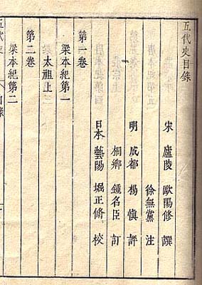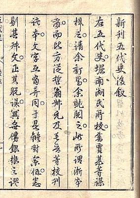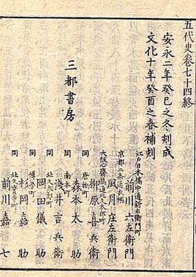 | 和刻本『五代史』とは、宋の歐陽修の『五代史記』こと所謂『新五代史』の翻刻本のことである。何故なら、江戸時代に出版された和刻本正史は、明の国子監本二十一史の翻刻であり、この二十一史が採取している『五代史』が歐陽修の『五代史記』であり、薛居正等『旧五代史』は採取されていない。因って、和刻本『五代史』と言えば、歐陽修の『新五代史』のことなのである。 問題は、この『五代史』が何時翻刻されたかであるが、一番最初の翻刻は安永二年(1773)の刊記を持つものであるが、この初印本は未だ見たことが無い。陽明文庫に所蔵されている『五代史』は、巻末に「安永二年癸巳之冬」と有るが、その左上に埋木した「取次所、云々」の一文が有れば、明らかに後印本である。 この未見の安永版以後は、文化十年(1813)修訂本・文化版後印本・慶応四年(1868)補刻本・明治十七年(1884)銅印本等が公刊されている。 尚、汲古書院が出版した和刻本正史シリーズの『五代史』は、監修者である長沢規矩也氏架蔵本の文化十年修訂本が採取されている。但し、この本は長沢氏自身が指摘されているが如く、村瀬栲亭の「新刊五代史後敘」を欠いた、文化十年版の後印本である。 |