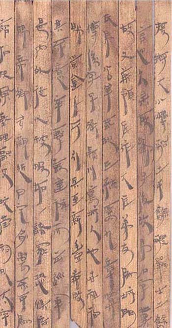 この竹簡や木牘を鞣し革や麻糸で繋ぎ合わせて簀の子状にしたものが竹簡書或いは木牘書であり、古代書籍の一形態である。この綴じ糸の鞣し革が切れる程何回も易を読み返して勉強したと言う故事が、孔子の「韋編三絶」である。尚、日本では一般的に木簡と称しているが、これは「木牘竹簡」の略称である。 |