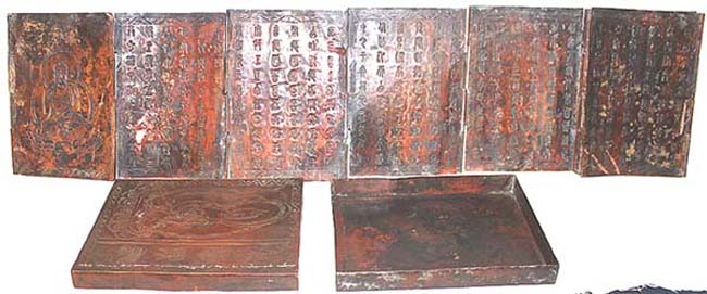 | ここに提示する銅板経は、中国の民国時代の品と措定される仏典で、箱入りの縦17.5cm・横12.4cmで12枚綴りのもので、沙門果経の中の『寂志果経』である。尚、本品は刻字ではなく、薄い赤銅板に篆書で果経が打ち出されている。 |
