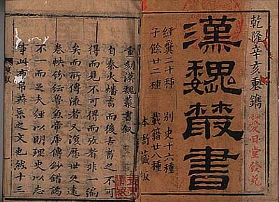 | ここに提示する叢書本は、乾隆56年重鐫の『増訂漢魏叢書』の最初の見開きと、民国12年排印の『漢堂類槁』の五史平議とである。 |