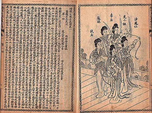 | 中国では清朝末から民國初期にかけて多数の大衆小説が出版され、その代表的なものが侠義小説類と情人(才子佳人)小説類とである。これらは主に上海を中心として錦章書局や廣益書局・江東書局等から石印本で刊行されるが、たいがい巻頭に数枚の圖像(登場人物や話の場面)が付けられており、形態は各冊が薄くて小さく、大概縦が約22.2cm・横が約13.5cmぐらいのものが一般的である。まさに何処にでも持ち運べて、読み捨て使い捨てが可能な大衆小説らしい形式である。そのため、出版された量や年代(今に近い)のわりには、日常世界の娯楽用俗書であるため、思ったほど当時の原本は残っていない。 |