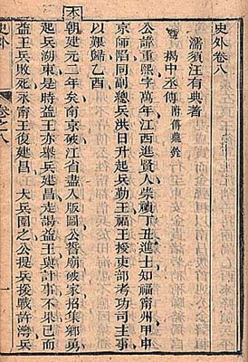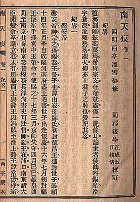 | ここに提示する二点の準禁書は、左は天津の王又樸が明朝に忠節を尽くした人士を列挙した『史外』(別名『前明忠義列伝』)で、乾隆十三年の序文を伴ってはいるが、一般的には約120年後の同治三年重刊本が出回っており、小生も寡聞にして乾隆刊本にはお目にかかったことが無い。右は四明の凌雪が南明の聖安帝・思文帝・永暦帝及びそれに拘わる人士の伝記を著した『南天痕』であるが、これも同治七年の跋文を伴ってはいるものの、略50年後の宣統二年に復古社から排印されたものである。 |