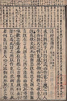 | 鼇頭本とは、本文に対する注の付き方に因る呼称である。本文の匡枠の上に更に枠を設定してその中に注を施した本を、鼇頭本と呼ぶが、本文の匡枠の上に何も枠などを設けたりしないで直接注を施した本は、眉上注本と呼んでいる。広義に解釈すれば、共に本文の頭上に注が施されていれば、所謂頭注本であることに変わりはないが、更にそれを枠の有無に因って分別し、枠の有るものを鼇頭本と呼び慣わしているのである。 |
