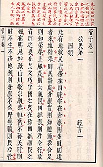 | ここに提示する『管子』は、左が趙用賢本を底本として明末天啓五年に朱養和が輯訂した、劉績増註・朱長春通演の花齋蔵版本明版管子(後にこれが、嘉慶九年の聚文堂版十子全書本に使用される)であり、右が同様に明末に呉興の凌汝亨が刊行した、趙定宇・朱大復・張賓王等評の朱墨套印本に依拠して、民国初年に刊行された石印本である。 |