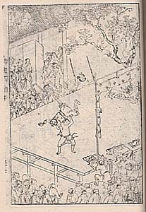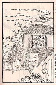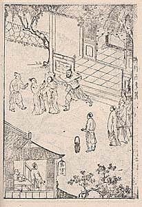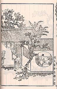 | 插圖とは、明清時代の主に小説類(無論学術的な書籍にも付載されてはいるが、その主要なものと言う意味で)を中心に、話の内容や展開を版画に彫り文中に付載されたものを指す。元代では「全相何々」と言い、明清時代は「繪圖何々」「綉像何々」「増像何々」等と称し、その呼称一様ではなく多様であるが、要は文章の内容を視覚的且つ補助的に説明するための版画であり、それが文中に差し挟まれているため插圖と称し、插圖を伴う仕立ての書籍を一般的に「插(帶)圖本何々」と総称するのである。 |