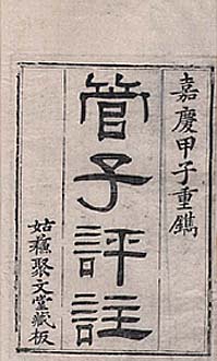 | 何種類かの書籍を集めて一つの名称で括る叢書は、宋代から作られ出すが、その中でも諸子を集めたものは明代に盛んに作られ出す。例えば、萬暦年間に周子義等が輯めた『子彙』(24種)や萬暦六年の謝汝韶輯『二十子家書』・萬暦十一年の顧春輯『六子書』等がそれである。この傾向は清代に至っても変わらず、清末光緒年間の浙江書局刊『二十二子』や崇文書局刊『百子全書』は、その代表的なものであるが、清の中期に在って、姑蘇の王氏と言われている王子興が嘉慶九年(1804)に聚文堂で刊行したのが、『十子全書』である。その内容は、『老子』『荘子』『荀子』『列子』『管子』『韓非子』『淮南子』『法言』『中説』『カツ冠子』の十書である。この中で、明人の註を伴うものは、『老子(帰有光、批閲)』と『管子(劉積、増注)』と『カツ冠子(王宇、評)』の三書、清人の註を伴うものは、『荀子(廬文昭、校)』の一書で、他の六書は漢から唐・宋に至る間の人の所謂古注が付せられている。この本は、既に嘉慶末から道光年間にかけて覆刊本が出されており、光緒年間に至ると浙江書局の重刊本や寶慶經綸堂重刊本が出されている。 |