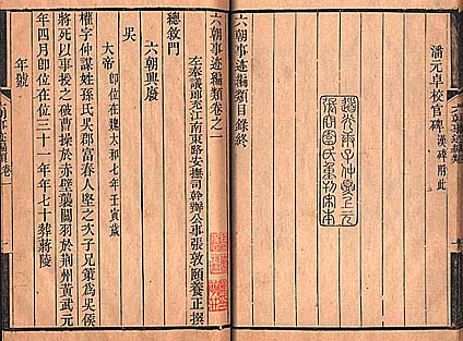 | ここに提示する地理書は、宋の張敦頤が撰した『六朝事迹編類』で、雑記に属するものであるが、版本としては、巻頭に道光辛丑正月の日付の沈兆ウン序文を付し、巻末に清の朱緒曾が撰した『附識』一巻を伴い、張問園が重刊したもので、『北京圖書館古籍善本書目』に「十行二十一字、黒口左右雙邊、道光二十年張問園刻本」と記載されているものである。 |