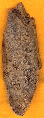| ここに提示するのは、河南省洛陽郊外から出土したと言われているもので、中国の鄭州で入手されたものであり、獣骨も文字の彫りも一見り古く、所謂いかがわしい倣品土産品等とは若干異なるが、裏にも文字が刻まれているのが、甚だ疑わしい。骨は牛の骨でやや古そうであるが、文字は新たに彫り込んで古色を付けたように見える。要するに、手の込んだ贋物であろう。 |