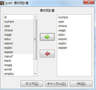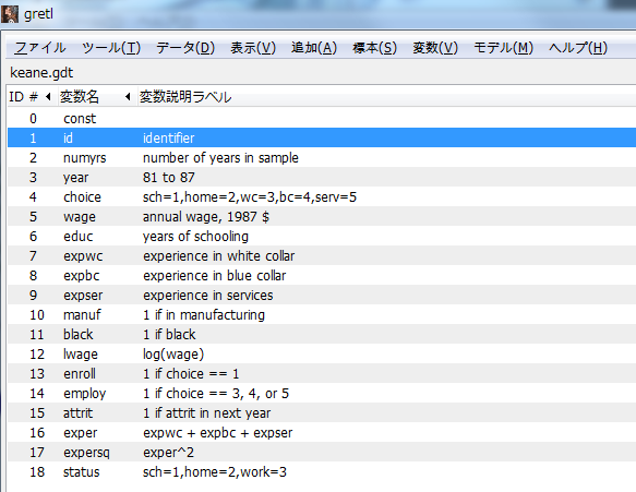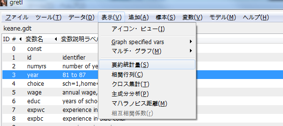ファイル>開く>サンプル・ファイル」で「GretlタブでKeane.gdt」を選択した場合