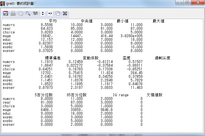 - 記述統計量は,gretlでは要約統計量という名前になっている.