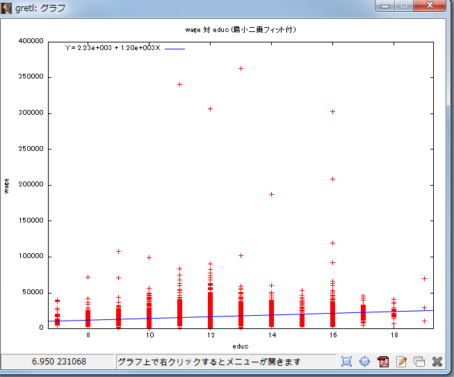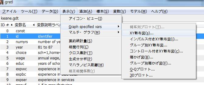 - 2変数の散布図がほしい場合には,「表示>graph specified var>xy散布図」を