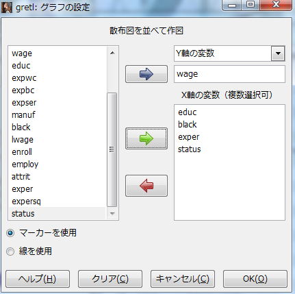 選択した後に,Y軸にあてはまる変数を1つ,X軸に入れたい変数を複数選んで