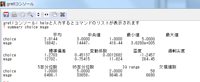 4-1 対話式コマンド画面(gretlコンソール)と,記述統計量コマンドsummary