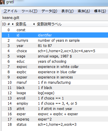 - ところで,gretlには変数番号IDが数字で割り振られている.変数でなくその番号を書いてもよい.
